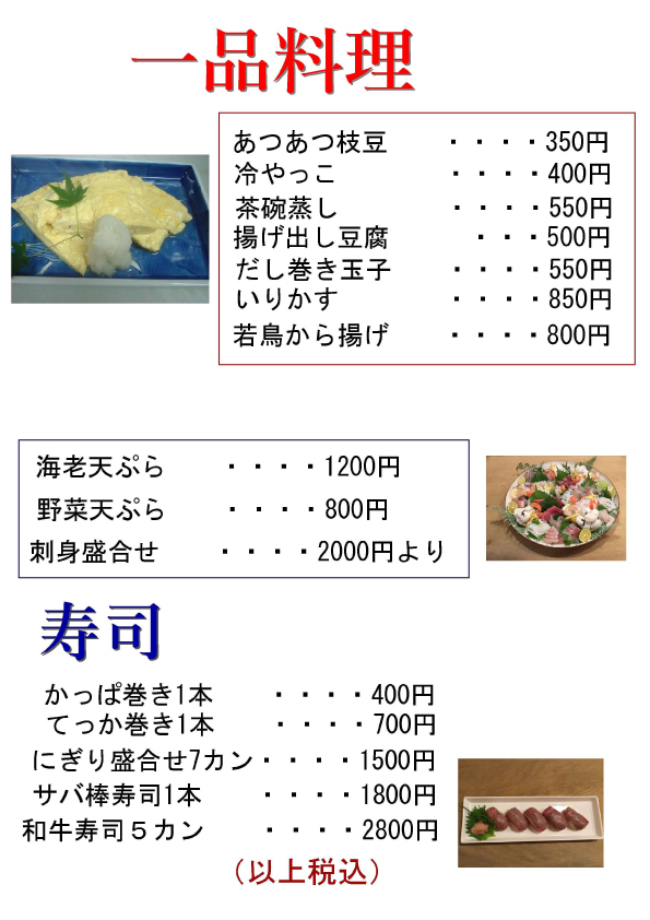吸い物・刺身・焼き物・煮物・揚物・蒸し物・酢の物など季節の食材や宴会の内容により変化いたします。お酒も一緒にお楽しみください。